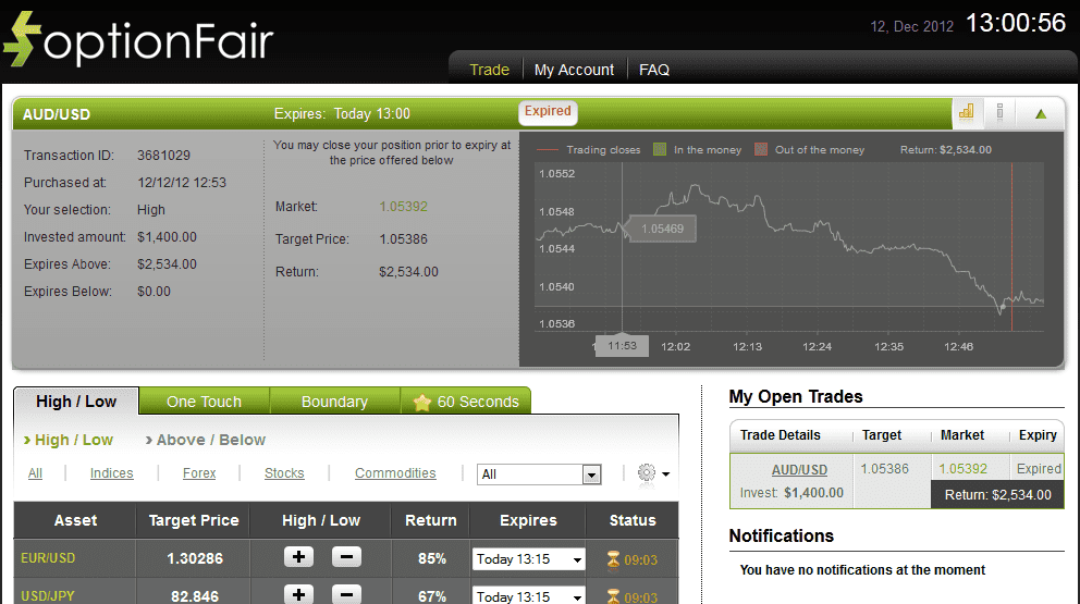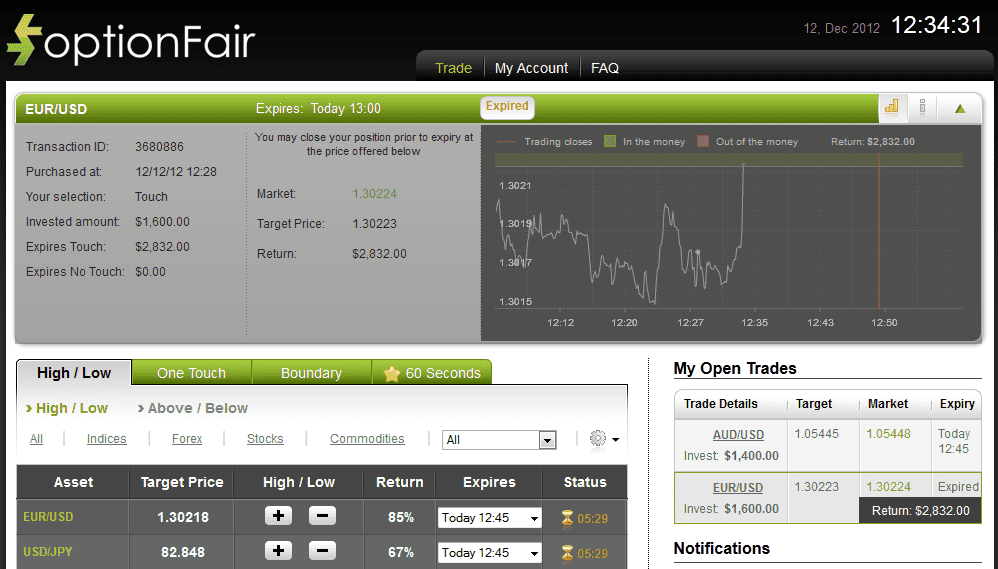 With optionFair’s trading platform, I traded $1600 on the “Touch” instrument. This kind of option has a possible return of 77% if the option touches the strike price prior to expiry, which means that if the signal is correct, I could get a return of $1232 on my investment.