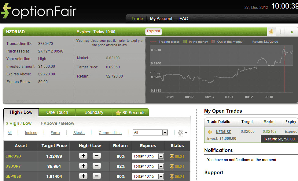 I logged into the optionFair trading platform and traded $1600 on the "High" instrument. This kind of option has a possible return of 70% if the option closes above the target price, which means that if the signal is correct I could get a return of $1120 on my investment.