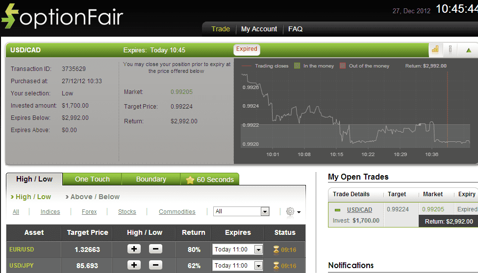 The market price for USD/CAD at the buying time (10:33) was 0.99224 for the expiry time of 10:45. The asset closed on 0.99205 and I made $1292 in less than 15 minutes.