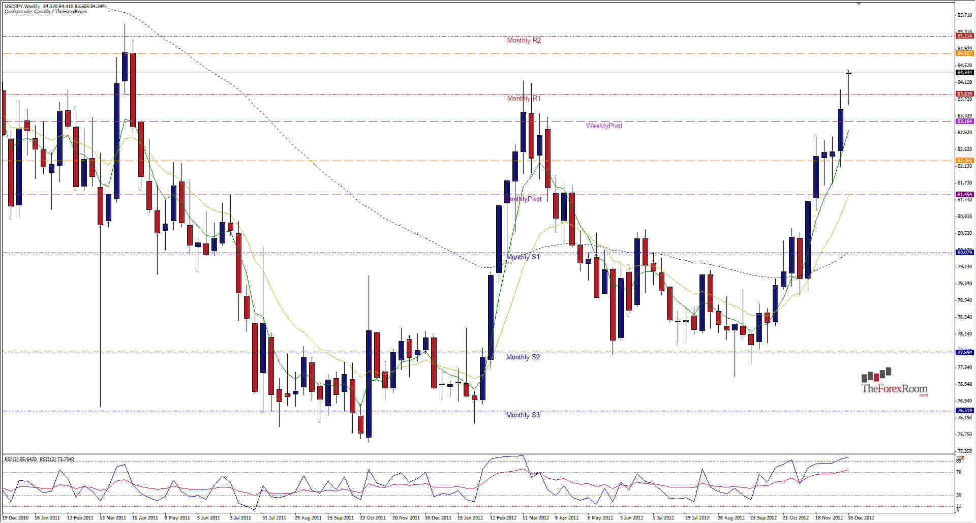 The USD/JPY has reached higher than the resistance level of 84.00 and is trading at 84.31 with about 2 hours left before the London open. The next area to watch is 84.80 which was the November low in 2009. Will we see the pair perform a correction at this level? If we clear 85.00 we could see 86.50 pretty quickly with 88-89.00 being the biggest hurdle for the bulls as the pair spent many weeks in 2009 & 2010 using this area as a springboard before finally dropping below it and staying below since June 2010. We all know that the Japanese Government is hell bent on devaluing their currency, but will they be able to weaken it enough to keep the Bulls going, and if so how far will they go? The Weekly RSI is in Overbought Territory, so if we do get a correction soon, look for support at 83.85 & 83.18 as well as 82.25. There is a high probability that we will see a correction soon, but we could also see another 'Santa Run' on this pair before the year is up.