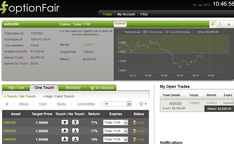 I logged onto the optionFair binary options trading platform and traded $1700 on the “Touch” instrument. This kind of option has a potential return of 70% if the option touches the strike price prior to expiry, which means that if the signal is correct, I could get a return of $1190 on my investment.