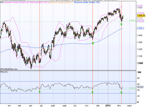 The signals provided by the RSI those past weeks have worked very well so far on the CAC40, and once again we bounced on this support as the index at the same time was supported by the swim lane of the cup and handle which target is around the 3830 points.