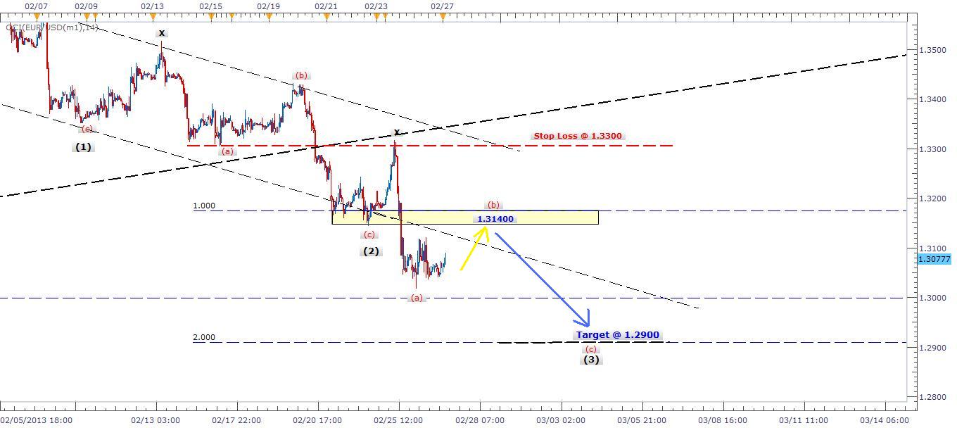 Description: Follow up on our last EUR/USD success gamble trade on Feb. 25 with hit target at 1.3300, a sharp drop took place after what it assumed X wave reaching a low of 1.30191. I will consider the pattern as the second ZigZag correction with ongoing correction which expected to touch the 1.31400 level today before it drops further toward the 1.2900 price level which is equal to wave (ii) of (v) (Not Shown on chart) to complete a larger triple ZigZags. I would suggest all traders to keep their eyes on 1.31400 or near that level to short the pair for expected +240 profitable pips. Good luck ;)