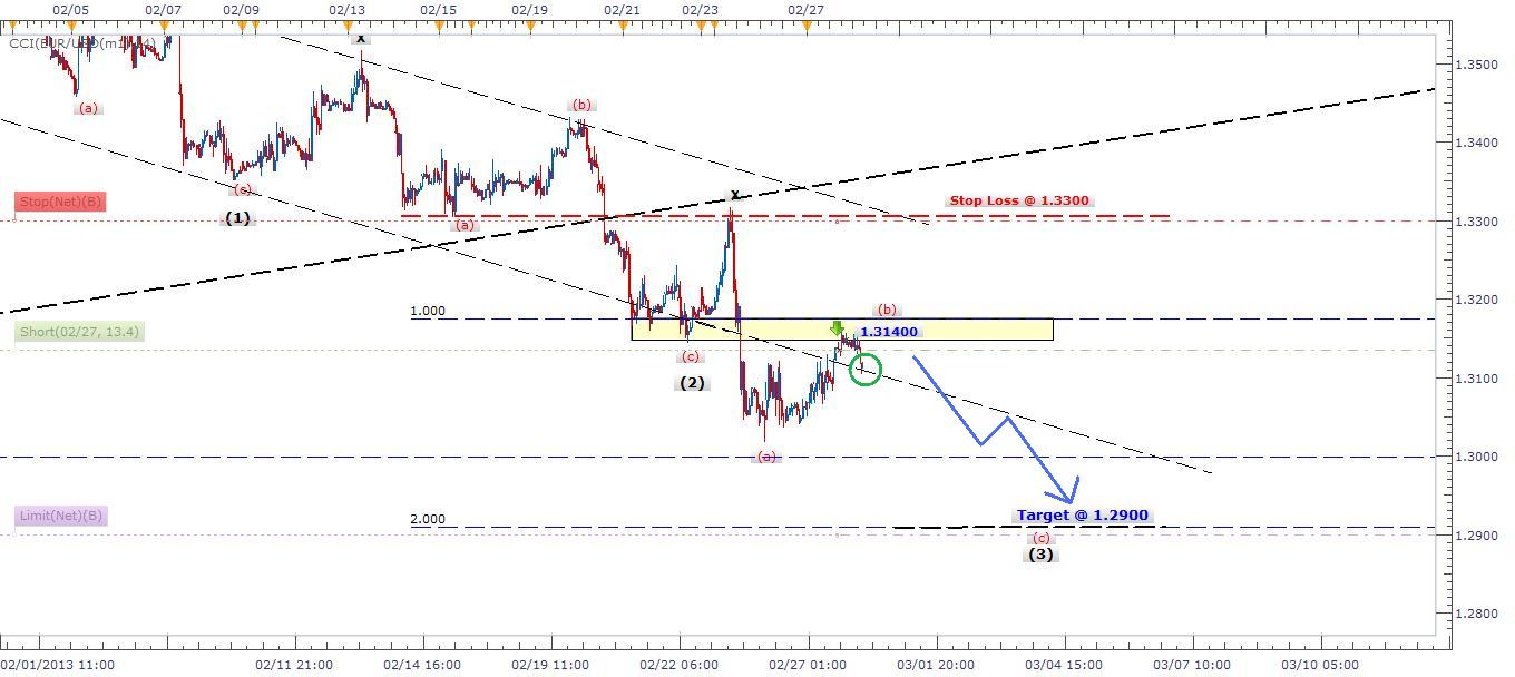 Description: Follow up on yesterday's trade call for EUR/USD, the pair has already went into the suggested SELL zone, and I executed a Sell order to get into the final wave of C targeting 1.2900 price level. I will move the preset Stop loss from 1.3300 to 1.3100 once the trends break below 1.30200 to book some profit. Let's watch the trend movement and to be updated once minor wave 2 get engaged.