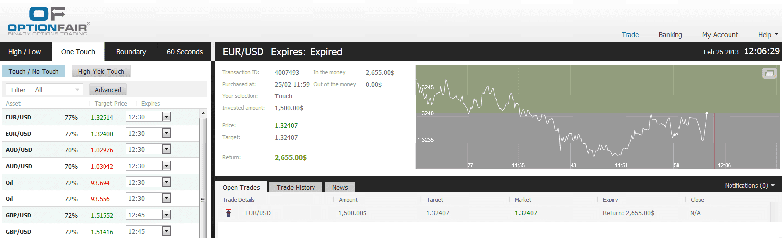 I logged in the OptionFair trading platform and traded $1500 on the “Touch” instrument, selecting the ‘down’ button. This kind of option has a possible return of 77% if the option touches the strike price prior to expiry, which means that if the signal is correct, I could get a return of $1155 on my investment.