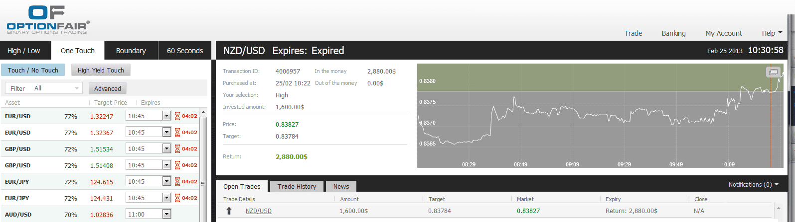 I logged onto the OptionFair trading platform and traded $1600 on the "High" instrument. This kind of option has a potential return of 80% if the option will close above the target price, which means that if the signal is correct I could get a return of $1280 on my investment.