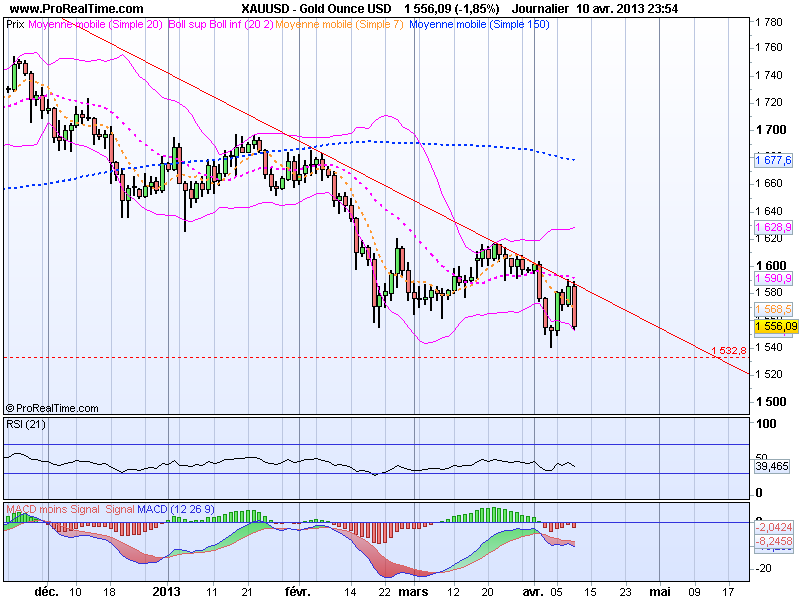 The ounce of gold is falling again following the contact with the downward oblique resistance in red on the graph. In terms of technical indicators, the RSI remains bearish under the neutral zone while the MACD, in negative territory, still operates under its signal. Investors will therefore attempt a bearish trade on the ounce of gold targeting the $1535 area, major support for several weeks. This scenario would be invalidated if we exceed the moving average at 20 sessions.