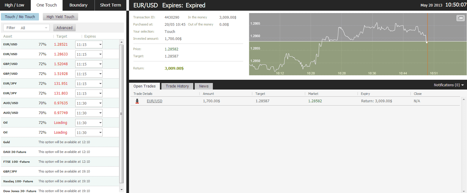I logged in the OptionFair™ binary options trading platform and I traded $1700 on the “Touch Down” instrument. This kind of option has a return of 77% if the option touches the strike price prior to expiry, which means that if the signal is correct, I could get a return of $1309 on my investment.