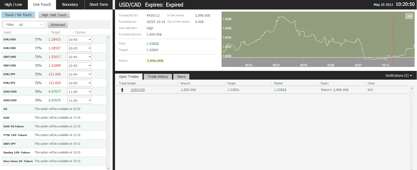 The target price for USD/CAD at the buying time (10:14) was 1.02801 for the expiration of 10:20. The Asset closed on 1.02828 and I made $1296.