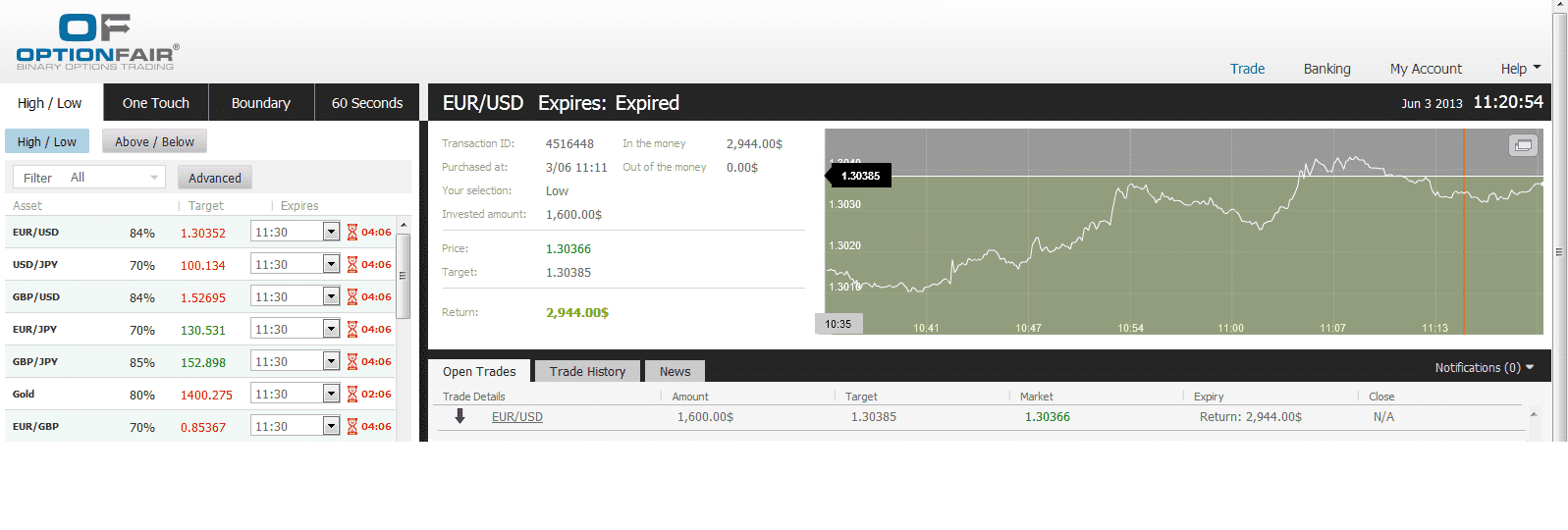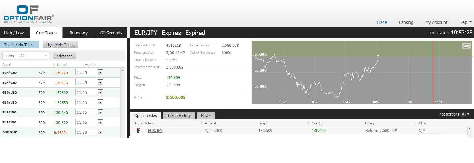 With OptionFair trading platform, I traded $1500 on the “Touch” instrument. This kind of option has a return of 72% if the option touches the strike price prior to expiry, which means that if the signal is correct, I could get a return of $1080 on my investment.