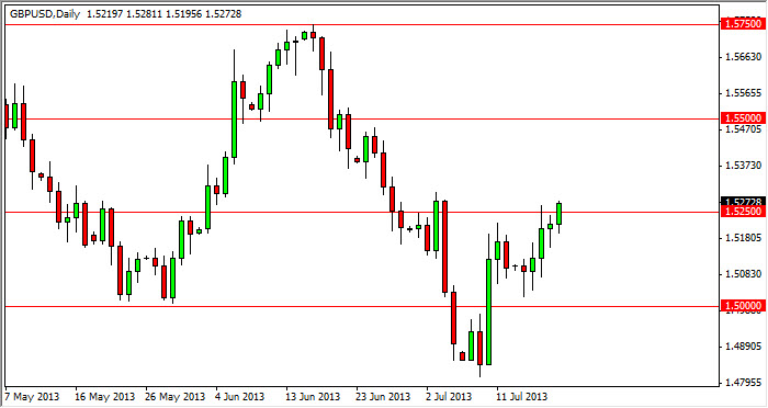 The GBP/USD pair rose during the session on Friday, as you can see smashing through the 1.5250 level. This is an area that I have suggested that would be resistive enough to keep the market down, but if it did not we could be going much higher. You can see that the market is currently pressing up against the highs from early July, so I think that this market breaking above 1.53 will remove all doubt, and send us looking for the 1.55 handle.