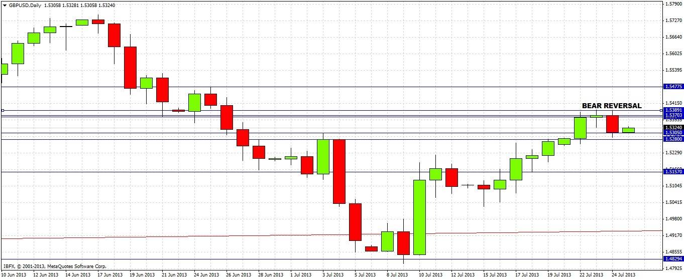 The picture becomes clearer in the daily chart. Yesterday was a bearish reversal, and in fact the USD did not just trace a reversal against GBP, but also did the same against EUR (weakly) and AUD (much more strongly), so we have to sit up and take notice of that: