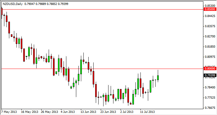 The NZD/USD pair rose during the session on Friday, but as you can see it found plenty of trouble at the 0.80 handle. This is an area that I suspected would be a bit of trouble for the buyers, and that's exactly what happened. The candle is shaped like a shooting star, and as a result this confirms what I thought about this area, but what I am concerned about as far as selling right now is the fact that there are two hammers in front of that candle. In other words, this market looks very confused at the moment, but I have to believe that the longer-term downtrend will eventually win out.