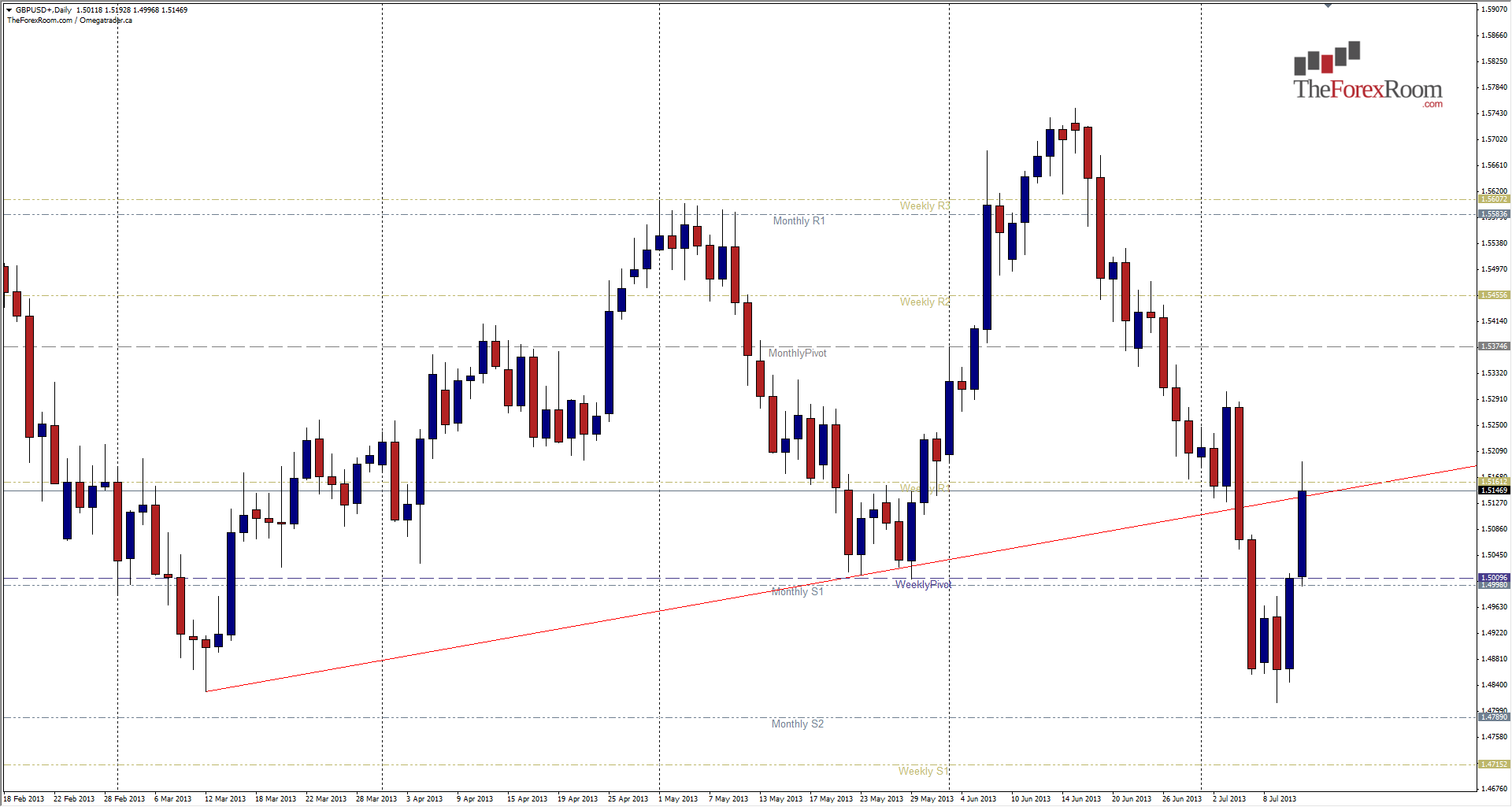The Sterling appears to have bottomed out at 1.4813 for the time being, just 17 pips lower than the previous 2013 low set on March 12. The British currency began staging its recovery after hitting the low on Monday at around noon in New York and inching its way higher for the most part, until Mr. Bernanke’s comments mid afternoon yesterday when the stage was set for a massive ‘risk on’ run higher to the recent high at 1.5155 set early in Asian trading. This has brought the pair upwards about 342 pips and back above the crucial 1.5000 level. We can see from the chart that the trend line which was broken last week is now being re-tested, not uncommon when a break out occurs, as is the Weekly R1 at 1.5160. Further resistance is visible at 1.5225 with the EMA50 at 1.5294 followed by the Monthly Pivot at 1.5375. Taking into consideration Carney’s intentions for the currency, we can expect to see measures implemented soon to weaken the pound in order t boost manufacturing and exports, but for now it is possible that we will have a continued running of the bulls. Failure to close above 1.5250 will see support become important again with the 1.5000 level of the most importance followed by 1.4800, a break of which will certainly take the pair much lower rather quickly.