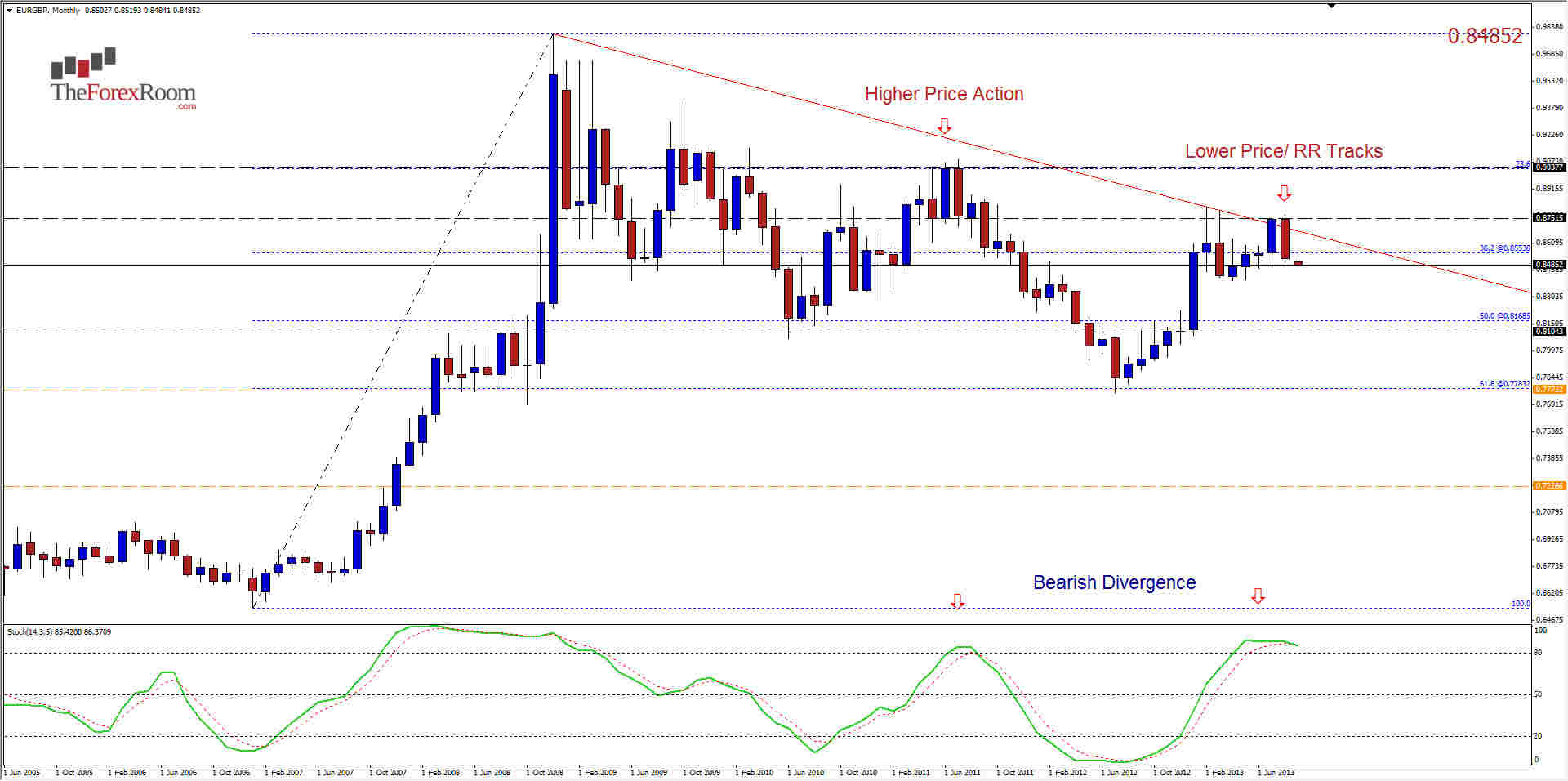 The EUR/GBP Monthly chart is showing clear bearish divergence. As you can see from the chart, we saw price action make a higher high back in February, but the Stochastic below barely made it over the 80/oversold level and still the pair fell almost 1000 pips after that formation printed. Now we see that we have a bearish engulfing/Maribuzo style set-up at the 0.8750 resistance level, basically the same low as we saw for the set-up back in February, but now we have a stochastic that clearly got above 80/overbought (and is already turning downward).