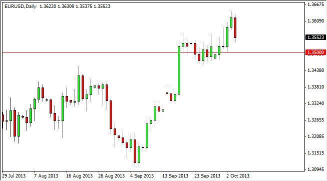 The EUR/USD pair fell during the session on Friday, as the nonfarm payroll numbers did not come out due to the US government shutdown. That being the case, the US dollar got a little bit of a reprieve as there was no bad news. That being the case though, I feel that it's only a matter time before the jobs number comes out and works in favor the Euro. Quite frankly, I do not see any real chance of the jobs number being strong.