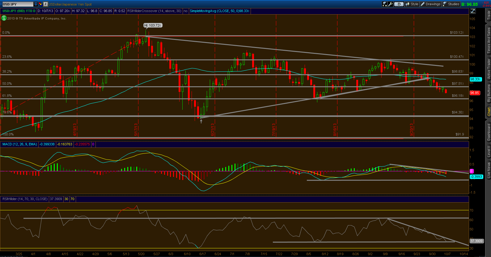 In September, I noted the 97.50 level being important support, of which this level was broken on 10/2. 97.50 was important for several reasons, one being 50% Fibonacci support. We have broken this Fibonacci level a few times since May, all of which did not pan out too well. In August, this led to support at 96.18, and in June, led to 78.6% or 94.30. I would use these too levels for buy/sell triggers. To either get long if we hold, or press down the short if we break lower. Also, if short, look to 97.50 as your stop/resistance level.