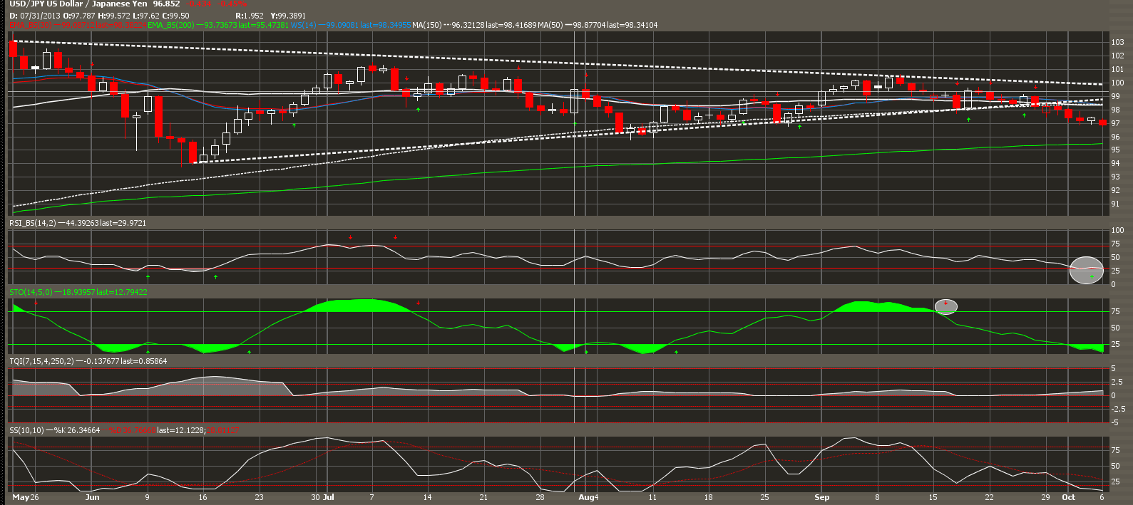 Looking more into the internals of the trend, MACD is on a continued downtrend. This trend started right at the top of the August-September rally at 100.50, and marked the sell-off perfectly. Currently, looks like MACD will continue down to its first support level at -62. This level also marked a mid-term bottom in the pair at 96. Relative Strength is also on a major downtrend, similar to the MACD performance. There is some support near current levels at 36.50, and will be an extremely important test for the buyers to either come back in, or sellers to continue their hold and take the USDJPY pair lower.