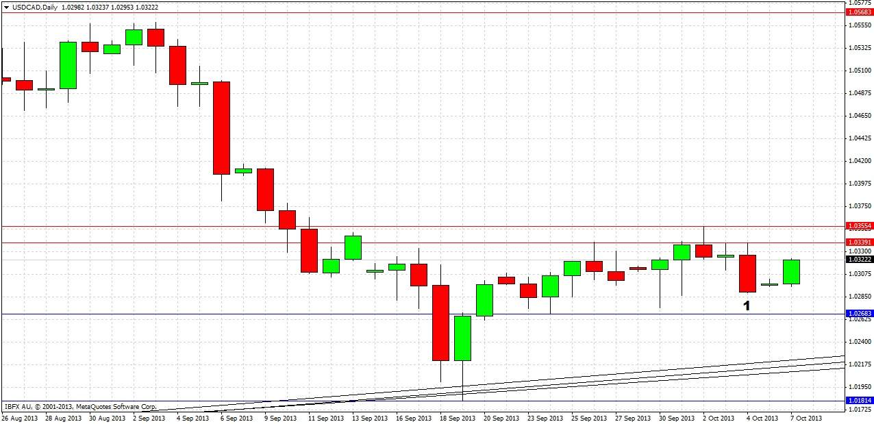 We can see that short-term resistance was established by both last week’s high at 1.0355, and the high of Friday’s bearish reversal candle (marked at 1) at 1.0339. Support is at 1.0268.