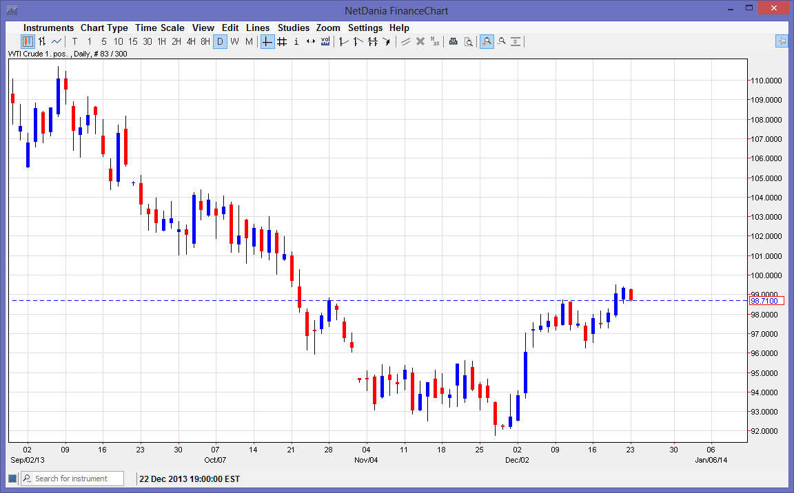 The WTI Crude Oil markets fell during the session on Monday, pulling back from the $99.50 handle. Ultimately, I see a lot of support just below current levels, and therefore I’m not willing to start selling into this move. That being the case, I think that most of the pullback has to do with the fact that we are approaching Christmas, and not any type of fundamental change in the outlook of the market.