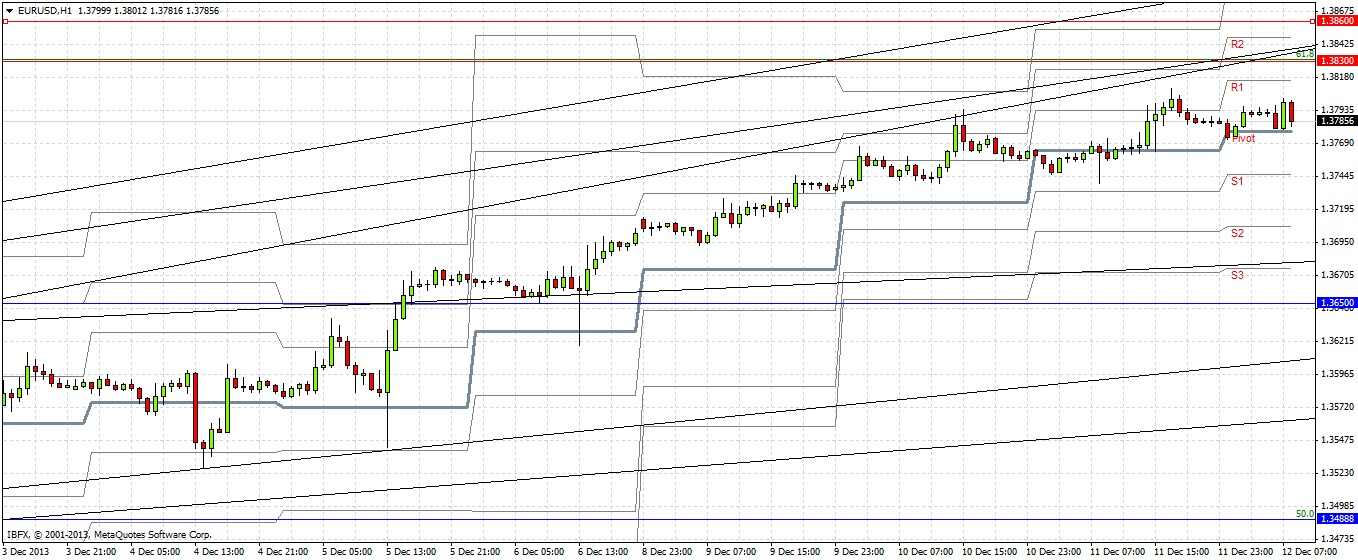 Due the confluence of the inner upper trend lines today with the support turned resistance zone from 1.3830 to 1.3860, and the 61.8% Fibonacci retracement level from the 2011-12 major downwards move, I am comfortable with a trade short if the price action should strongly reject that zone.