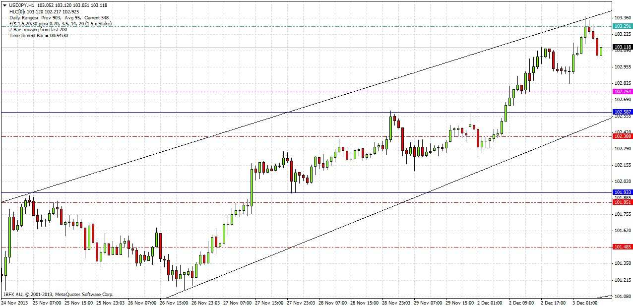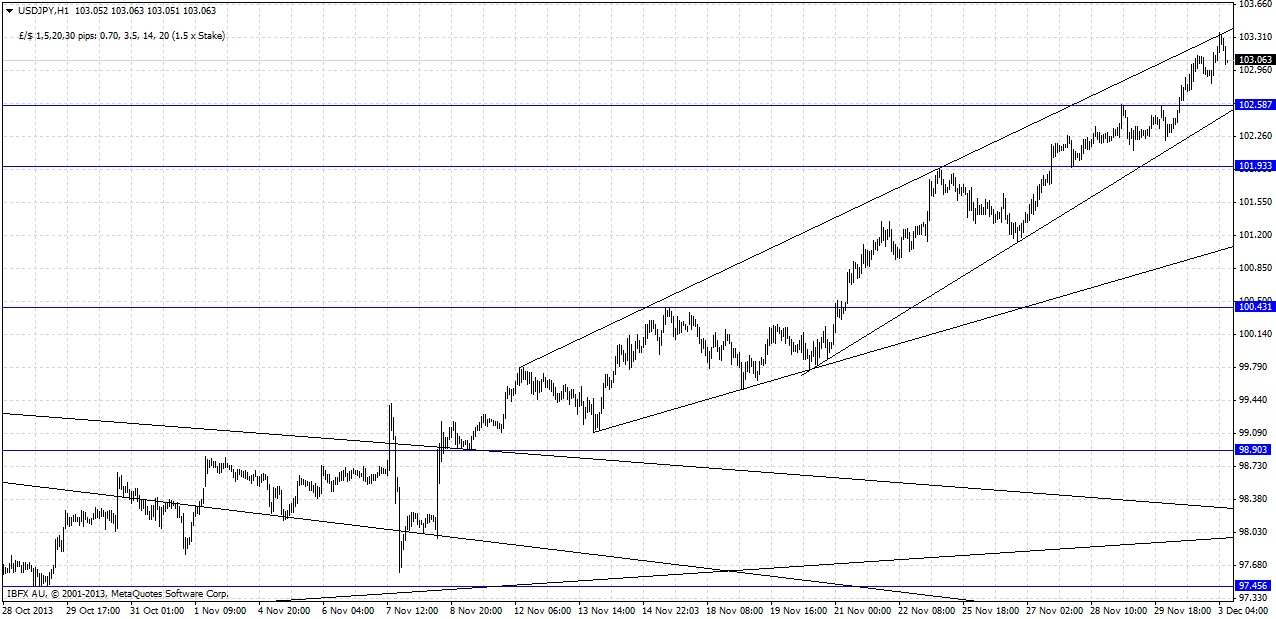 The pair has been in a strong uptrend since early November, when it broke very bullishly out of its restraining triangle. It broke strongly upwards through some quite well-established resistance levels. There is long-term resistance overhead at 103.72; however of more immediate interest is the second touch of the upper channel trend line that has been established since just after the breakout from the triangle in early November: