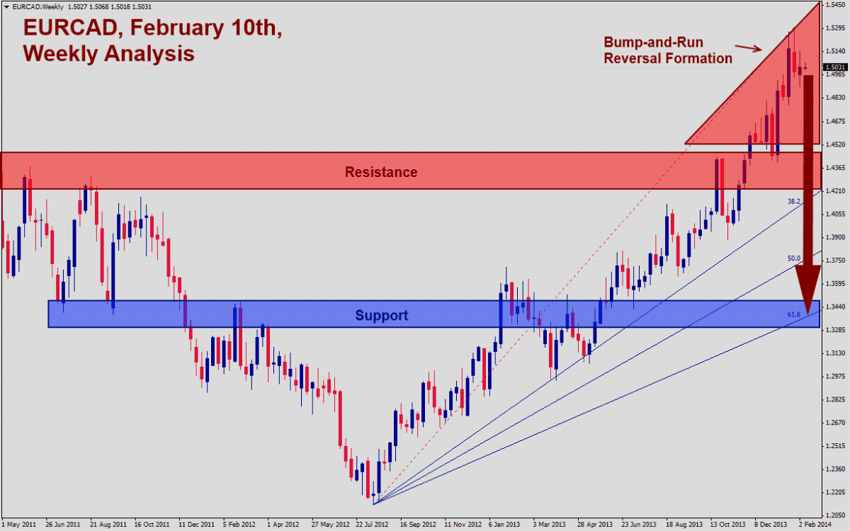 The EURCAD has rallied sharply without a major retracement which makes the uptrend vulnerable to a bigger correction. After a breakout from its resistance zone this currency pair has formed a bump-and-run reversal formation which may ring in the expected correction.