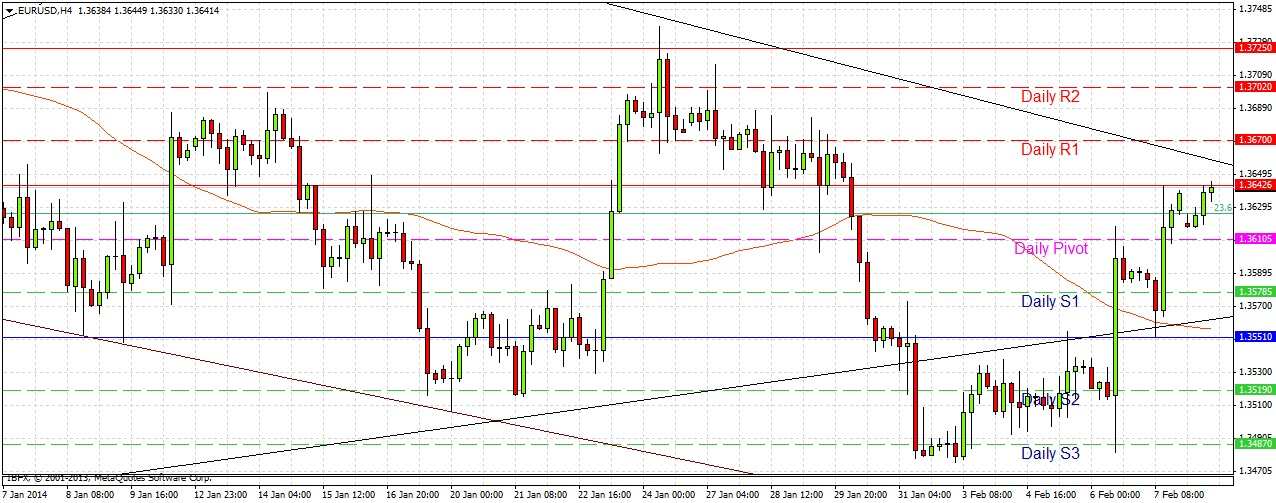 Move the stop loss to break even when the trade is 25 pips in profit and let it run. Take 75% of the position as profit at 1.3640.