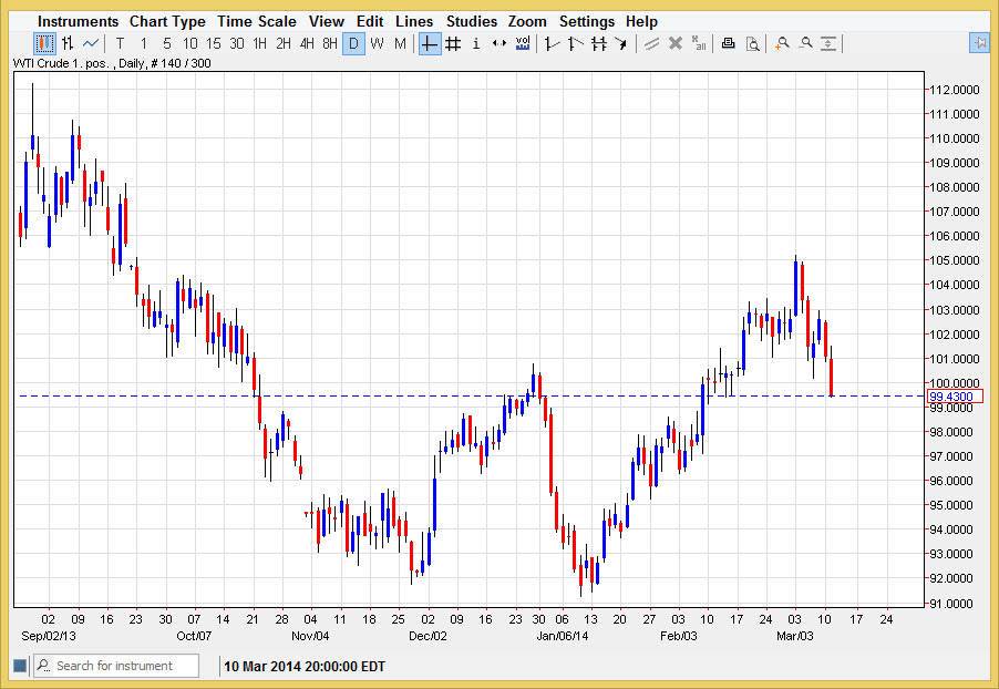 That being said, I believe that the “W pattern” that we had formed recently suggests that we are in fact going to go higher eventually, it’s just a matter of time. I think that the concerns around the world are going to play havoc with all financial markets, and this one won’t be any different. With the situation in the Crimea ready to start nerves back up, it wouldn’t take much to imagine this market going much higher as concerns about Russian oil being taken off of the market creep into play.