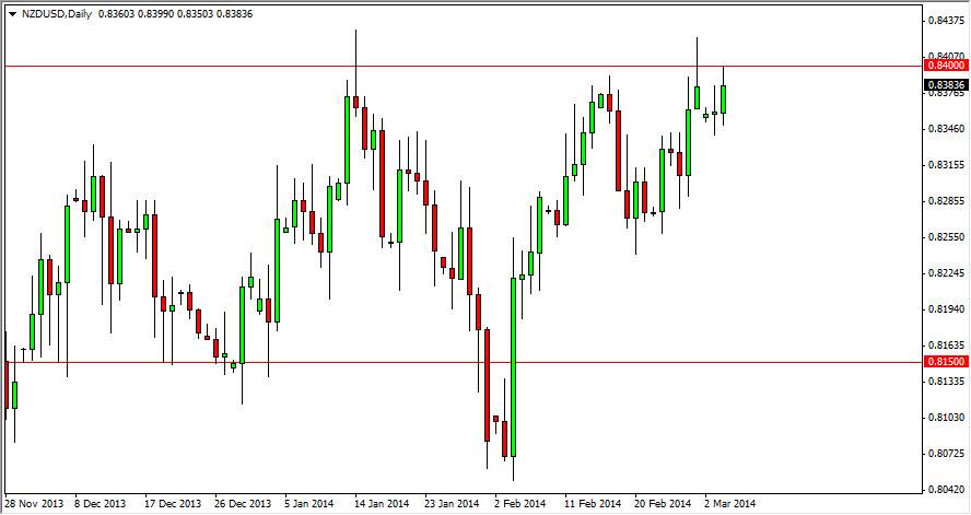 The NZD/USD pair rose during the session on Tuesday, slamming into the 0.84 level. This is an area though, that has caused a significant amount of trouble for the buyers in this market. A perfect example would be the shooting star that was formed on Friday, as you can see we pierced the 0.84 level, but could not break out to the upside for any significant length of time. However, the shooting star also gives us a buying opportunity, as a break of the top of that shooting star shows a significant break out above resistance.