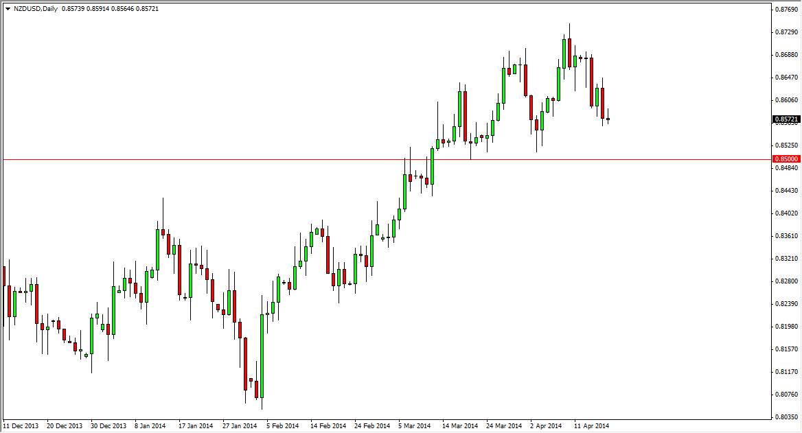The NZD/USD pair tried to rally a bit during the session on Friday, but with the Good Friday holiday in full fact, liquidity just wasn’t enough to push the market in one direction or the other. That being the case, there is a too much you can read from the daily candle, but the fact is that the hair has been drifting lower lately, and even with the pullback at this point in time, we are still well above significant support at the 0.85 handle. Because of this, I believe that this market could very easily pullback a little bit, before finding a significant amount of support down at the aforementioned 0.85 level.
