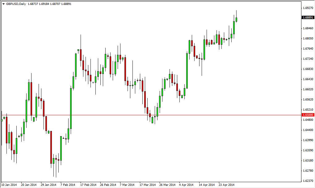 The GBP/USD pair tried to rally during the bulk of the session on Thursday, but as we approached the 1.69 level, sellers came back into the marketplace to push the British pound back down. Because of this, the market ended up forming a shooting star, which of course is a very negative sign. However, the fact is that the market is very bullish, and as a result I don’t look at this is a market that I want to start selling. In fact, I believe that the market is one that you should be waiting to see some type of supportive move lower. Obviously, a break down from here could find plenty of support, especially at the 1.68 handle.