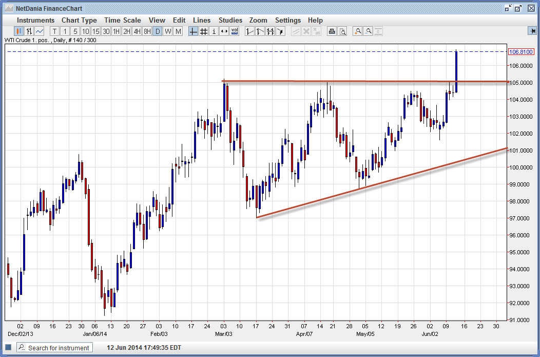 The $102 level below should offer plenty of support, and I think it is the “floor” in the market at the moment. I also see a lot of support at $99, so a break of the floor could only move it a bit lower. I have no idea how to short this market with this kind of momentum – so every time it falls it will be a signal to start buying again.