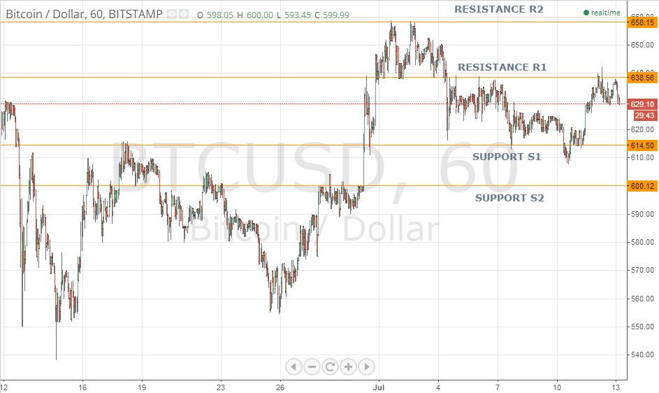 The past week was marked by BTC/USD trading in a narrow range of 25 points between resistance R1 and support S1. During the period, the pair touched a high of 642.57 and a low of 607.90 but looks set to end the week on a flattish note. Each Bitcoin is currently valued at $629.10.