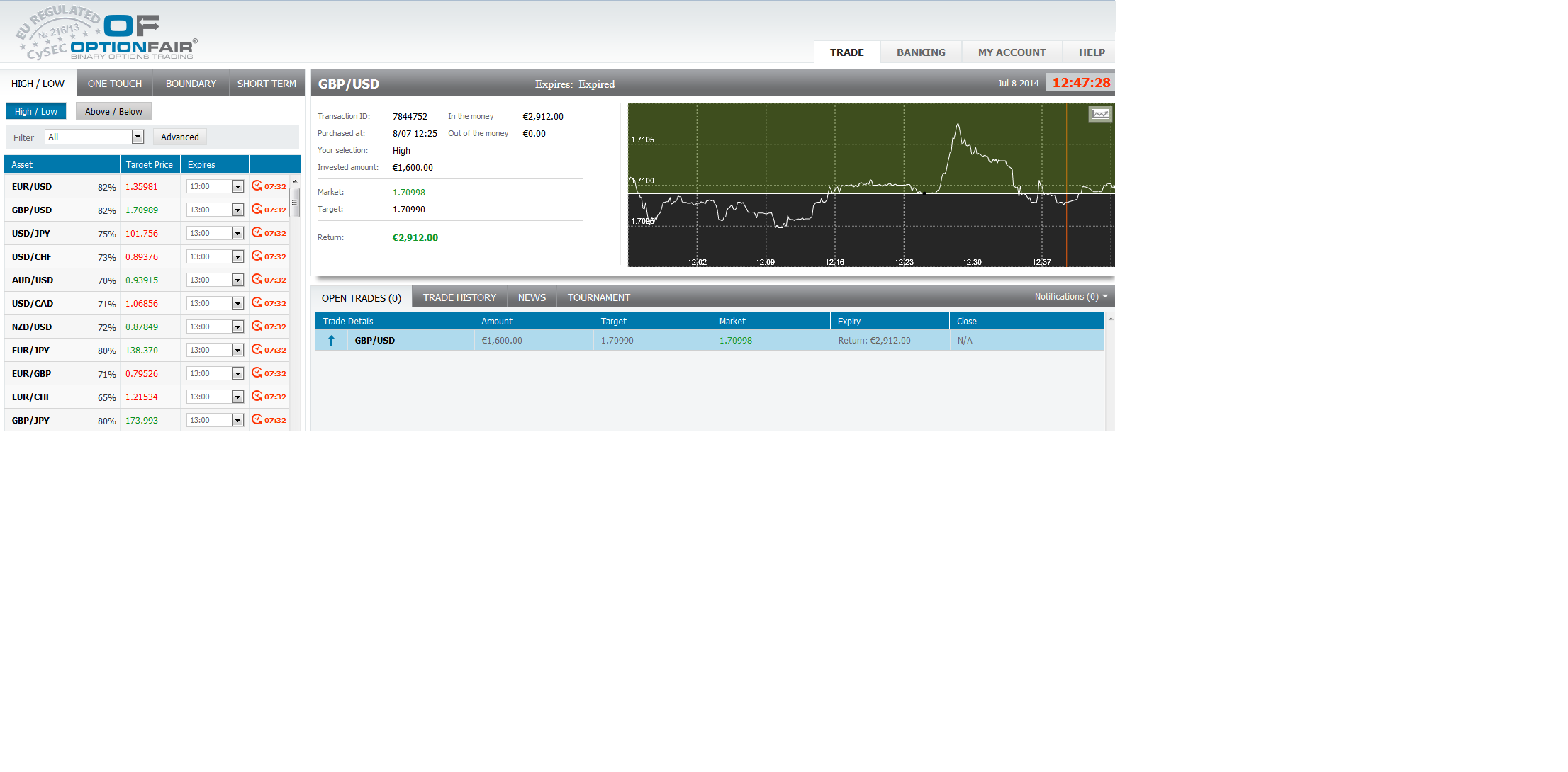 With optionFair™ binary options trading platform, I traded $1700 on the “Touch” instrument. This kind of option has a return of 75% if the option touches the strike price prior to expiry, which means that if the signal is correct, I could get a return of $1275 on my investment.