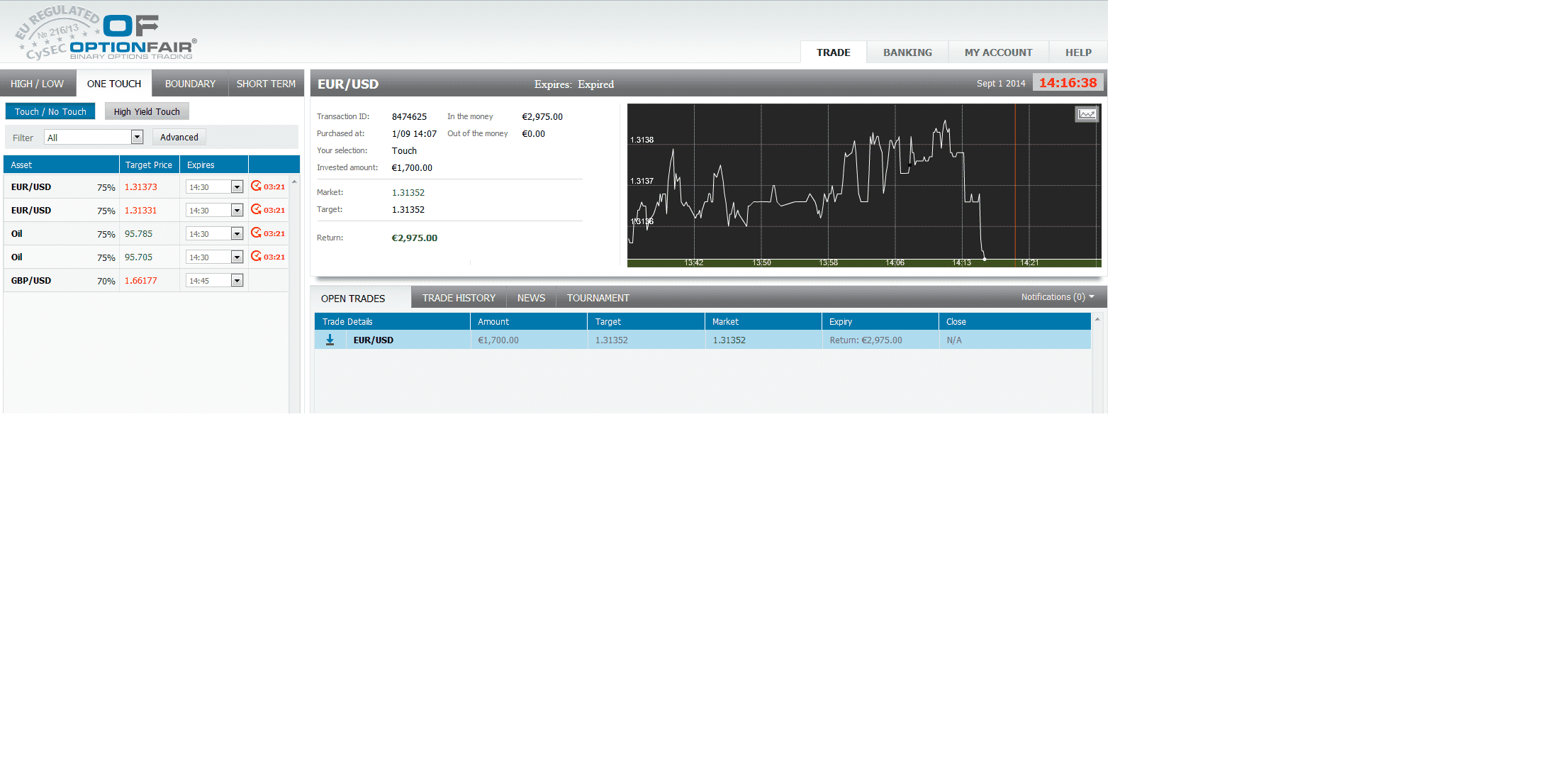 I logged in the OptionFair™ binary options trading platform and I traded $1700 on the "Touch Down" instrument. This kind of option has a return of 75% if the option touches the strike price prior to expiry, which means that if the signal is correct, I could get a return of $1275 on my investment.