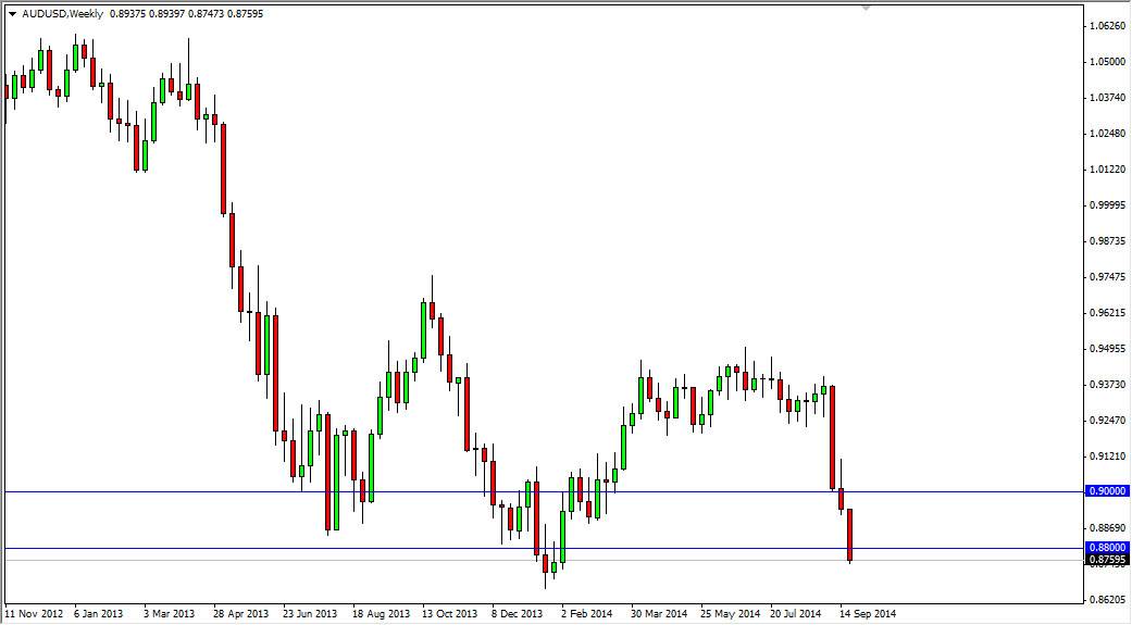 The Aussie dollar fell again during the week, slashing through the 0.88 level without too many issues. The fact is that the market is reaching an extreme bottom at this point in time, so a bounce wouldn’t be that big of a surprise to me. However, I think that any bounce at this point time should be thought of as a selling opportunity. I believe that the gold markets will continue to be a bit of an anchor on the Australian dollar as well, so I have no interest in buying.