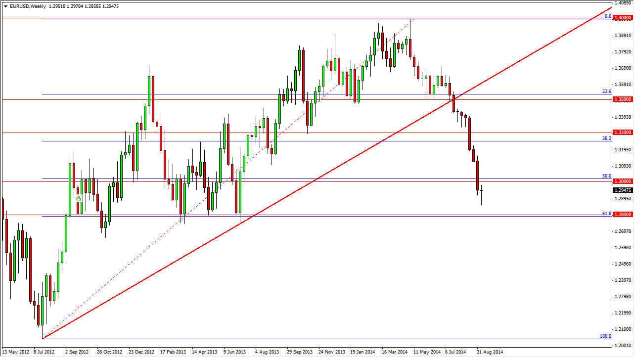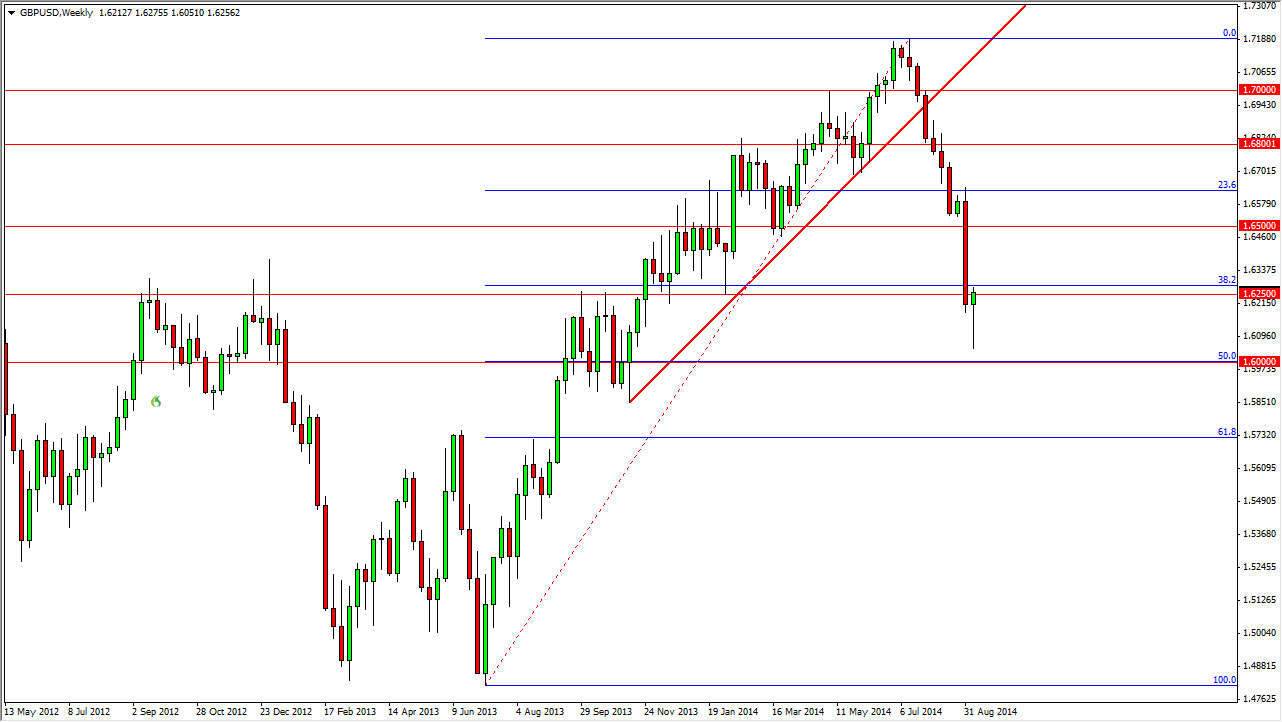 The GBP/USD pair has fallen off of a cliff lately. However, you can see that we have formed a massive hammer for the week. It formed the just above the 1.60 handle, and I believe that finally we are starting to see some people look at the possibility of the Scottish not leaving the United Kingdom. If that’s the case, the British pound will get massive buying pressure. I think that’s what we are getting ready to see as the referendum vote is on Thursday. I think the Scottish are going to stay, and therefore the British pound is a buy above the top of the hammer for the week.