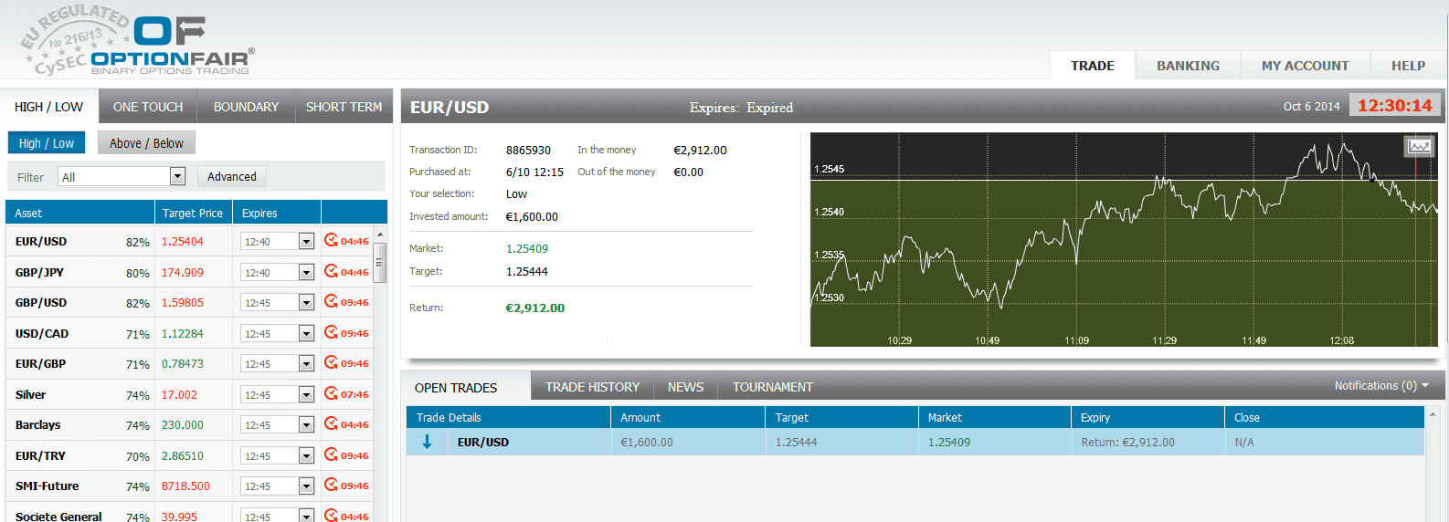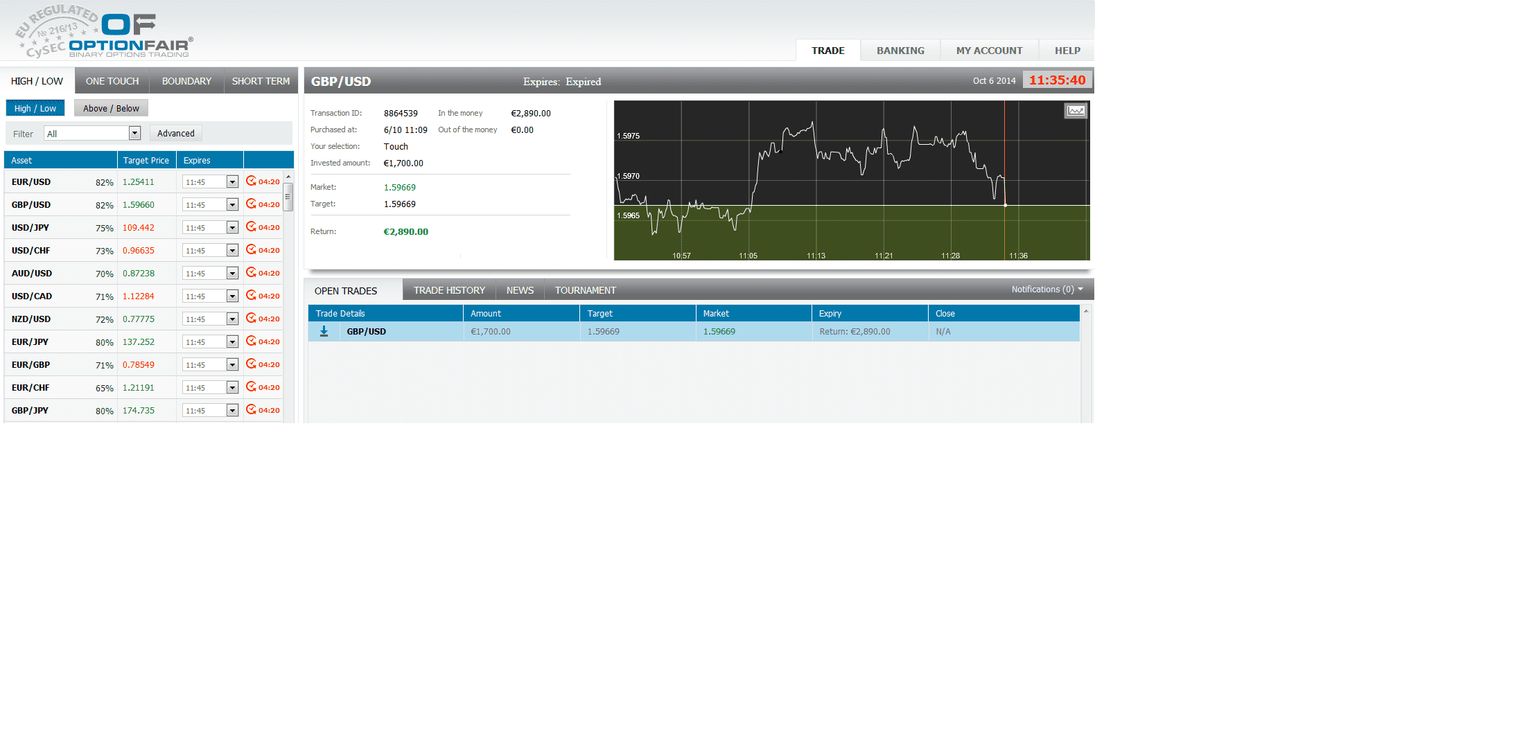 I logged in the OptionFair™ binary options trading platform and I traded $1600 on the "Low" instrument. This kind of option has a return of 82% if the option will close below the target price, which means that if the signal is correct I could get a return of $1312 on my investment.