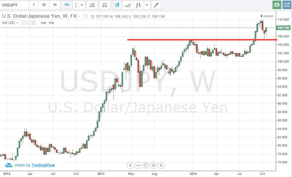 The GBP/USD pair had a very volatile week, essentially forming a neutral candle. However, we did break above the top of the hammer from the previous week and I believe that the market is slowly starting to show signs of buyers stepping in and picking up the British pound overall. I also look around the Forex markets and see that the British pound is starting to show signs of support everywhere. Because of this, I believe that a break of the top of the range for the week is more or less a buy signal.