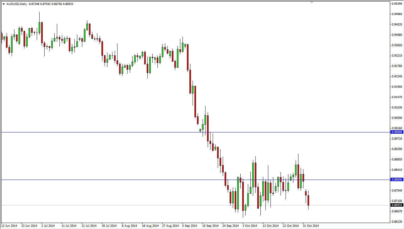 Looking at this chart, if we do bounce from here, I will simply look for some type of resistant candle on the shorter-term charts in order to continue selling the Australian dollar. I would be especially interested near the 0.88 handle, as it is an area that has certainly brought out the sellers recently. I also recognize that a break below the 0.8650 level would more than likely have this market heading down to the 0.85 handle rather quickly, and as a result I would be a seller of that particular move as well.