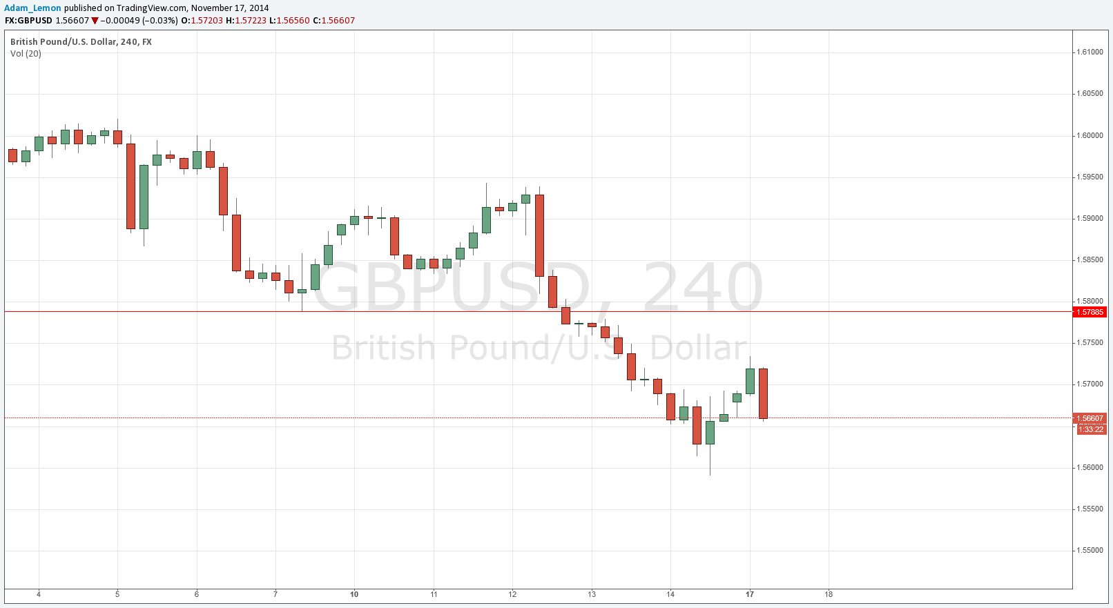 The price briefly broke the 1.5600 level on Friday before recovering quite strongly. The chart currently shows an uncertain picture which has been typical lately. There are no obvious levels of interest except for a previously supportive inflection above us at 1.5789 that could prove to be an interesting level at which to look for short trade. Unfortunately it is quite likely we will not reach that price today.