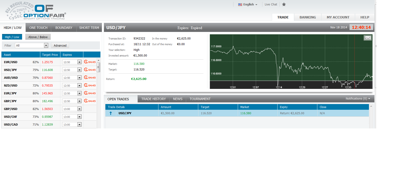 I logged in the OptionFair™ binary options trading platform and I traded $1500 on the "High" instrument. This kind of option has a return of 75% if the option will close above the target price, which means that if the signal is correct I could get a return of $1125 on my investment.