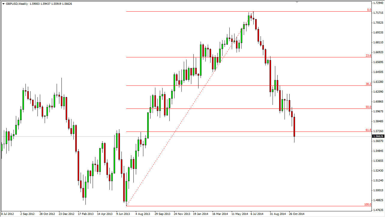 The GBP/USD pair broke down during the course of the week, and sliced through the city 1.8 Fibonacci retracement level. Ultimately though, we did form a hammer on Friday, so that could be a short-term bounce first before we continue to go lower. When you look back towards the beginning of 2013, you can see that there is a significant amount of noise in this general vicinity. Because of that, I think that although we are going to go lower, it’s going to be a bumpy ride from here. I am bearish of this market on rallies though.