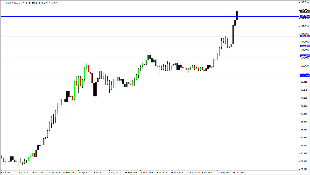 The USD/JPY pair broke out during the course of the week, and finally close well above the 115 level. Because of this, I feel that this market is going to continue to go higher, and that any pullback at this point time is simply a buying opportunity. Look at dips as potential “value” in the US dollar, as the Federal Reserve have stepped out of the quantitative easing game, while the Bank of Japan looks to step on the accelerator. I believe that this pair is in a multi-year long-term uptrend.