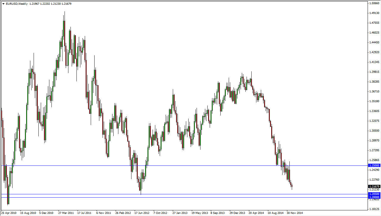 The EUR/USD pair has been in a massive decline for some time now, but when I look at this chart I recognize that we may be reaching the end of the downtrend, at least for a while. After all, the 1.20 level below is a massive support barrier that we have seen come into play a couple of different times over the last five years. With that being the case, and the fact that we have sold off so viciously, I believe that we are reaching the end of the downtrend, at least for the short-term.
