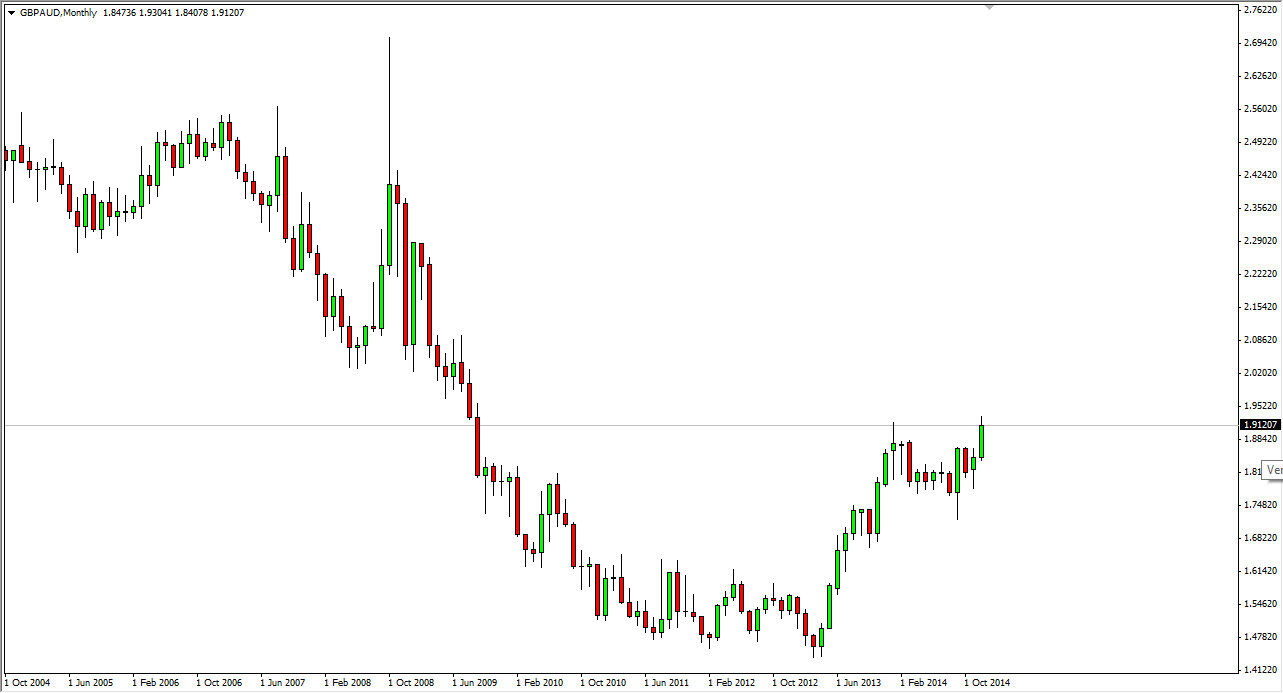 The GBP/AUD pair broke higher during the course of the month of December, clearing the 1.90 level with significance. That being the case, it appears that the pair is ready to continue going higher as we have recently broken out of significant consolidation. In fact, I think that the market looks as if it’s ready to continue going all the way to the 2.0 level without too many issues, and that’s exactly where I believe we will end up at by the end of the quarter.