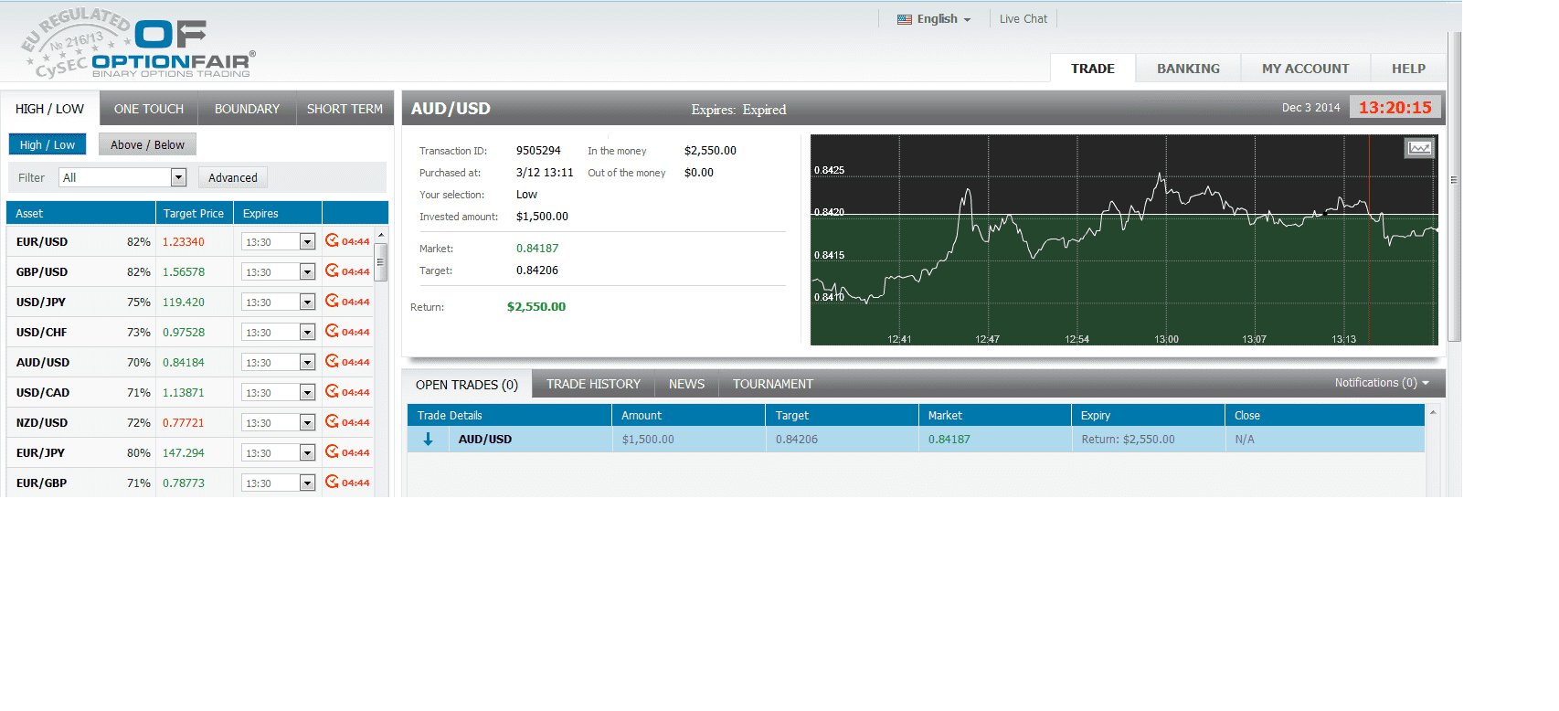 I logged in the OptionFair™ binary options trading platform and I traded $1500 on the "Low" instrument. This kind of option has a return of 70% if the option will close below the target price, which means that if the signal is correct I could get a return of $1050 on my investment.