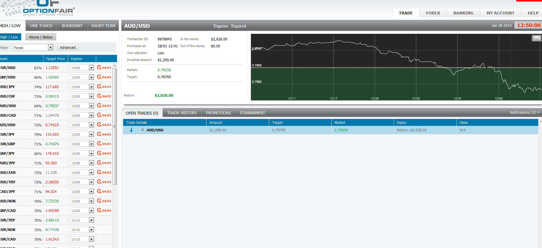 I logged in the OptionFair™ binary options trading platform and I traded $1200 on the "Low" instrument. This kind of option has a return of 69% if the option will close below the target price, which means that if the signal is correct I could get a return of $828 on my investment.