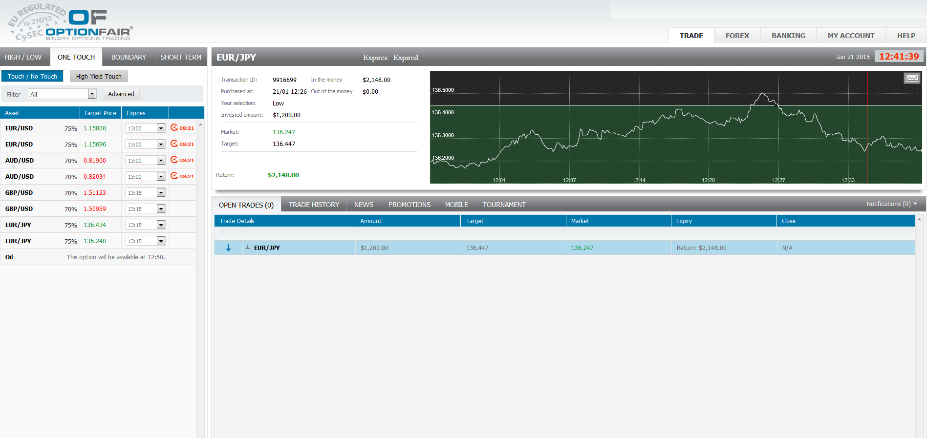 I logged in the OptionFair™ binary options trading platform and I traded $1200 on the "Touch Down" instrument. This kind of option has a return of 75% if the option touches the strike price prior to expiry, which means that if the signal is correct, I could get a return of $900 on my investment.